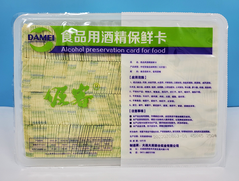 本產品是一種新型外用(非添加劑類)的保鮮劑,主要藥劑成分食品酒精。通過酒精在空氣中的氣體揮發(fā)能有效殺菌,達到產品保鮮目的。由于其緑色,無污染,得到越來越貭泛的應用。産品成分配料:特級食品酒精、紙片。